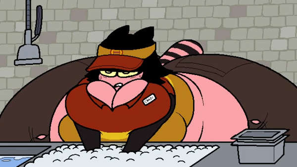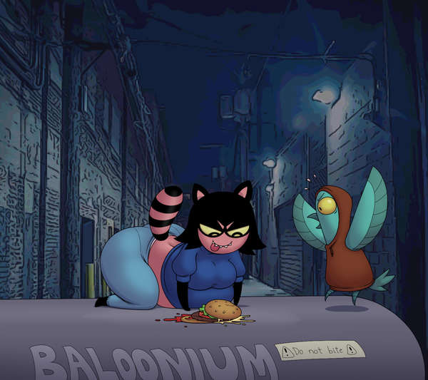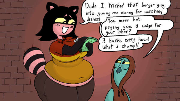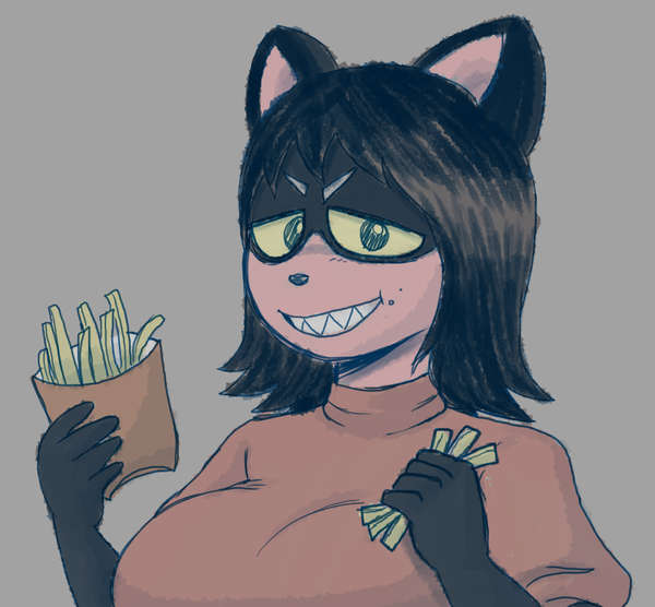 A trash-eating raccoon girl who lives free from the constraints of good manners and social tact. She loves greasy fast food and videogames even though she sucks at them.
